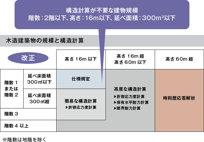「許容応力度計算」「許容応力度等計算」の適用範囲は、下記の通りです。