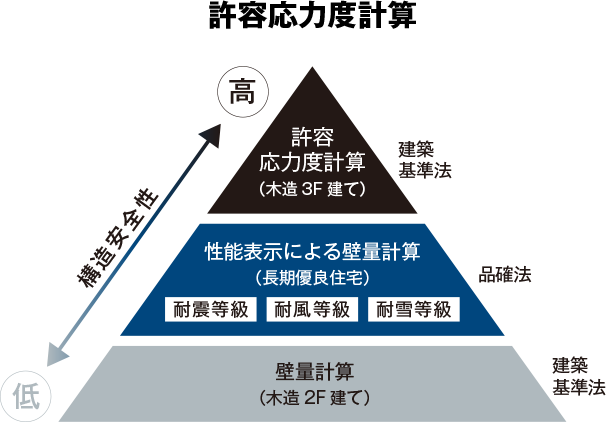 「許容応力度計算」を行う場合は、「壁量計算(品確法)」よりも考慮する事項が多く、より詳細な検討を行っています。
