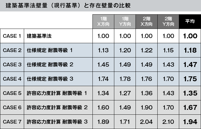 ※基準法の壁量検定値を1.00とした場合の各CASEの存在壁量