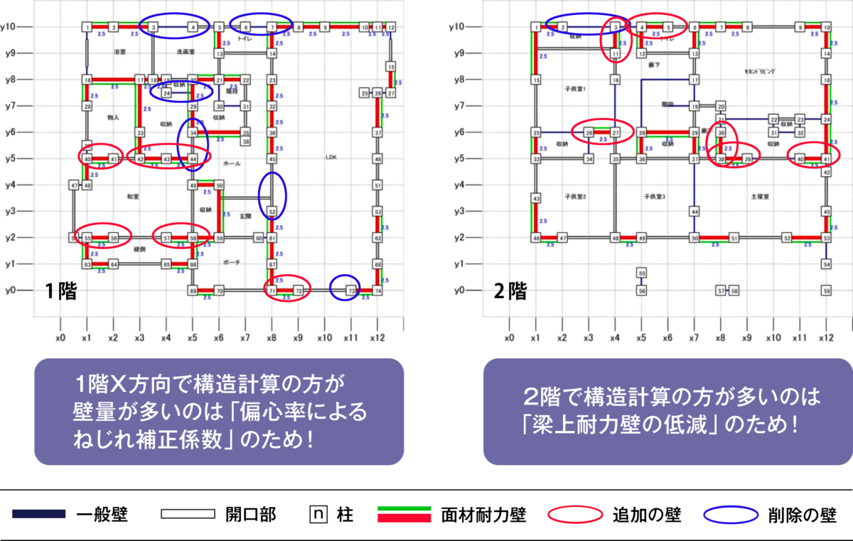 存在壁量を比較すると同じ耐震等級でも、「許容応力度計算」を行う方が存在壁量は多くなる結果となりました。許容応力度計算には、「梁上耐力壁の低減」や「偏心率によるねじれ補正係数」による影響があるためとなります。